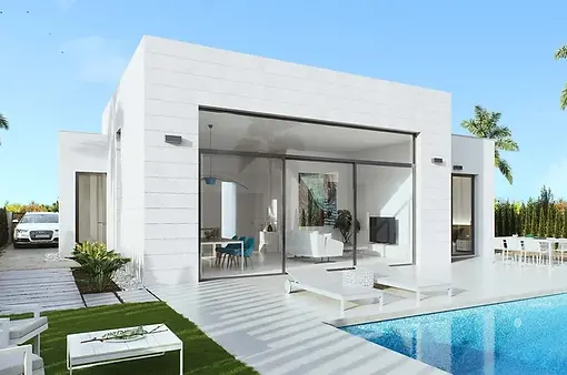 Villa Premium is een moderne gelijkvloerse villa met een open leefruimte vol licht en een naadloze overgang tussen binnen en buiten. Met drie slaapkamers, twee badkamers en een privézwembad biedt ze alles voor comfortabel wonen onder de Spaanse zon. Het stijlvolle ontwerp en de rustige ligging maken haar ideaal als vaste woning of tweede verblijf.